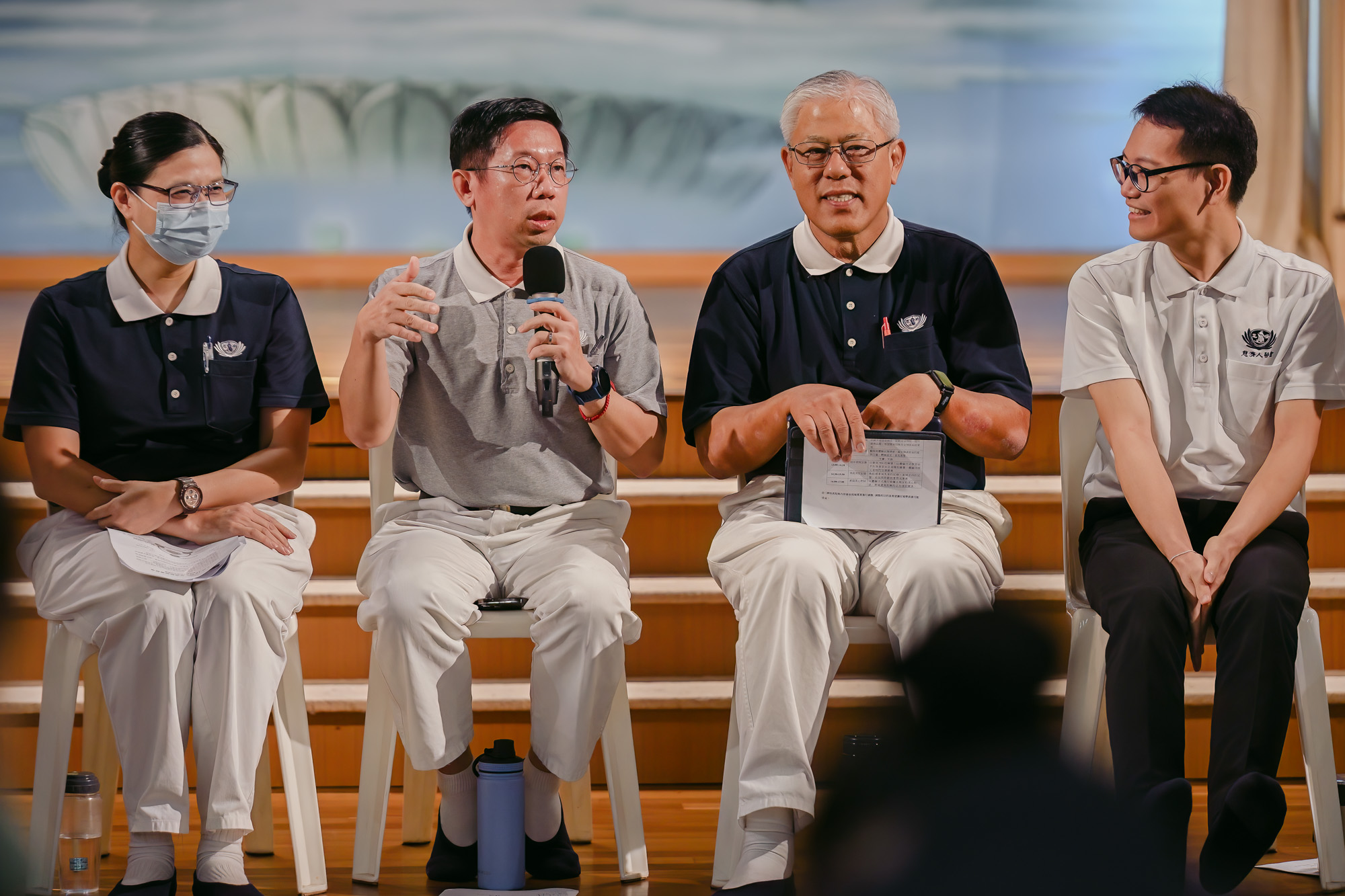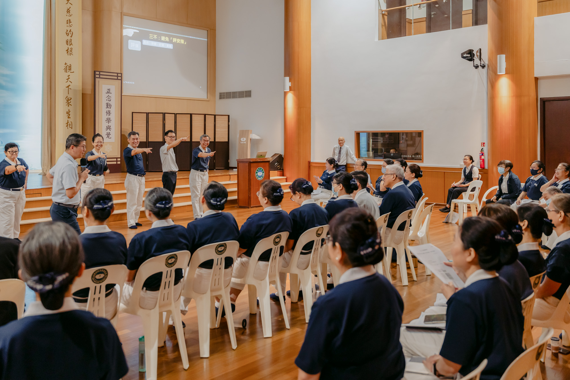 On August 9 and 10, 2025, about forty participants, including Tzu Chi home visit staff, dialysis centre staff, home care teams, and community volunteer Dharma family care team, gathered at Jing Si Hall to learn how to accompany care recipients and patients while also attending to their own emotions, fostering care for both themselves and others.