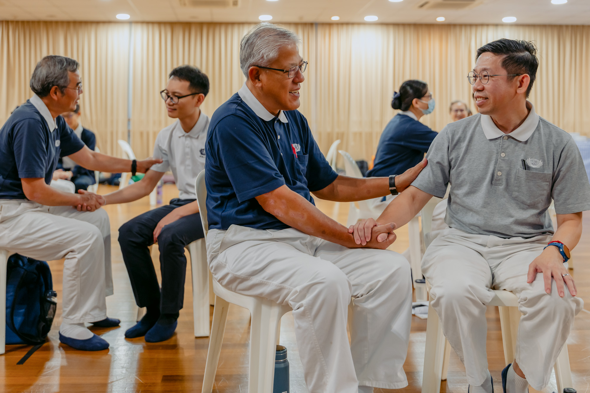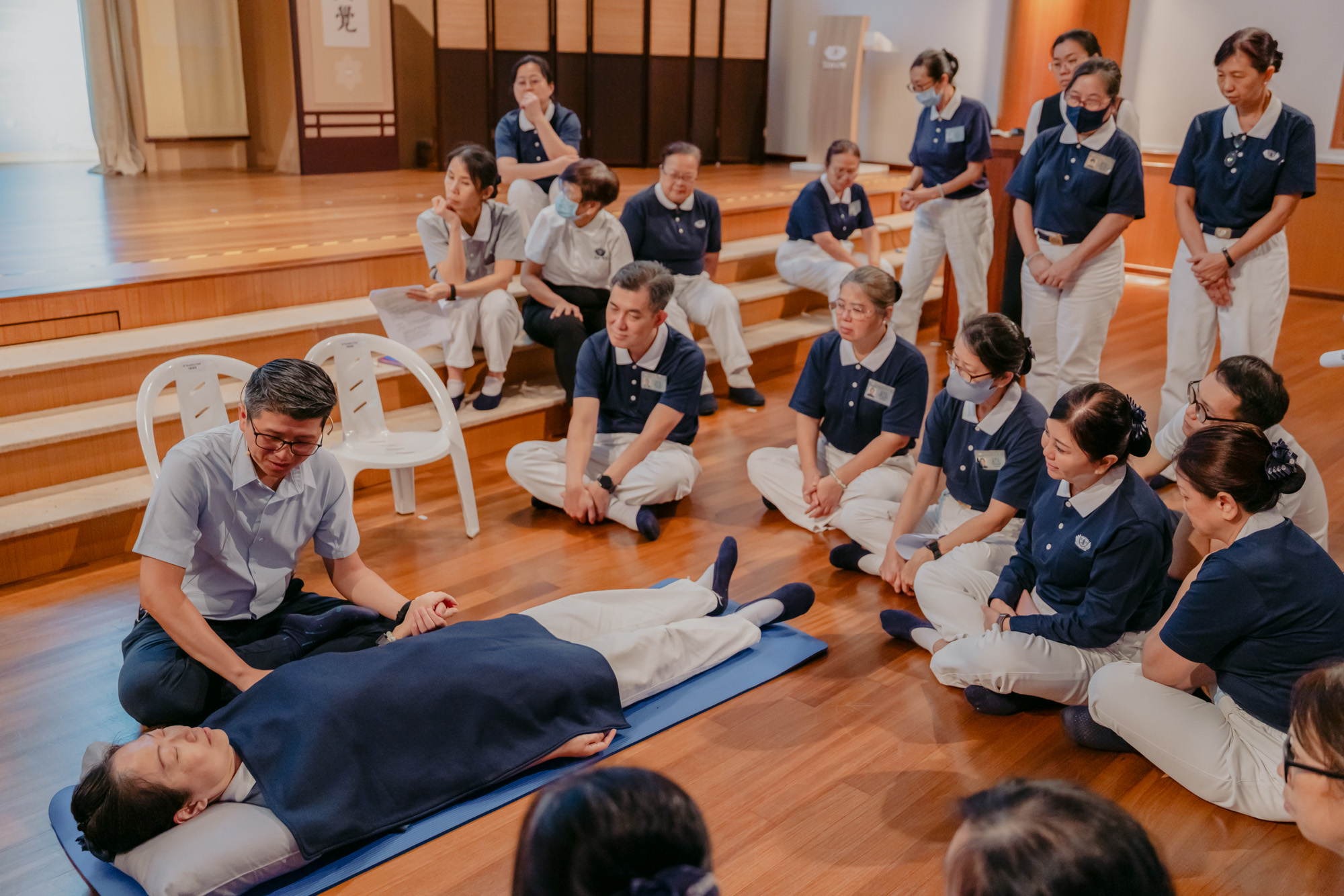 In front of the class, participants demonstrate the “Three Don’ts” of care—avoiding judgment, consolation, and advice—led by Dr Lo. (Photo by Khor Kim Seng)