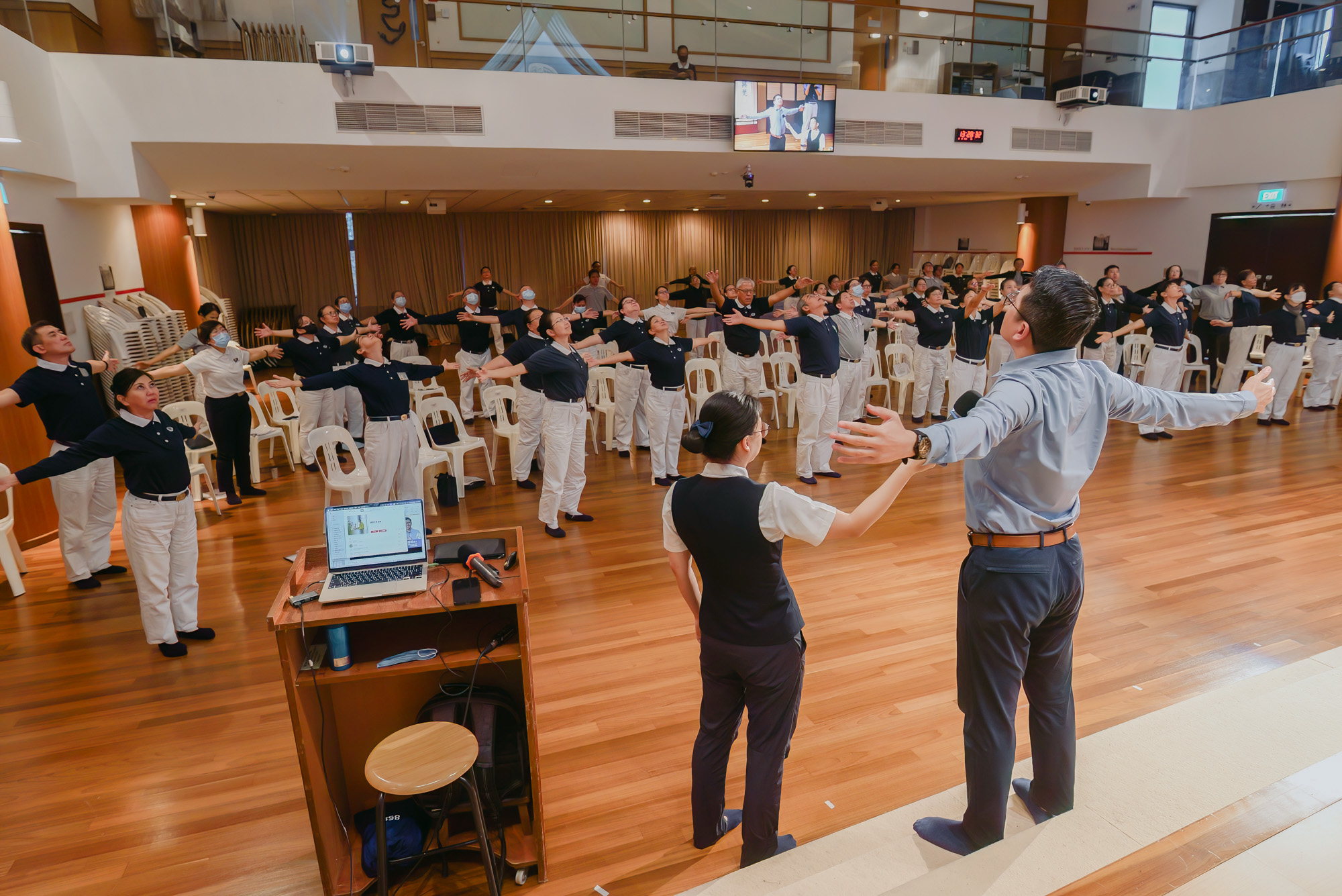 Dr Lo guiding the participants to do breathing and stretching exercises to relax both body and mind. (Photo by Lai Tong Heng)