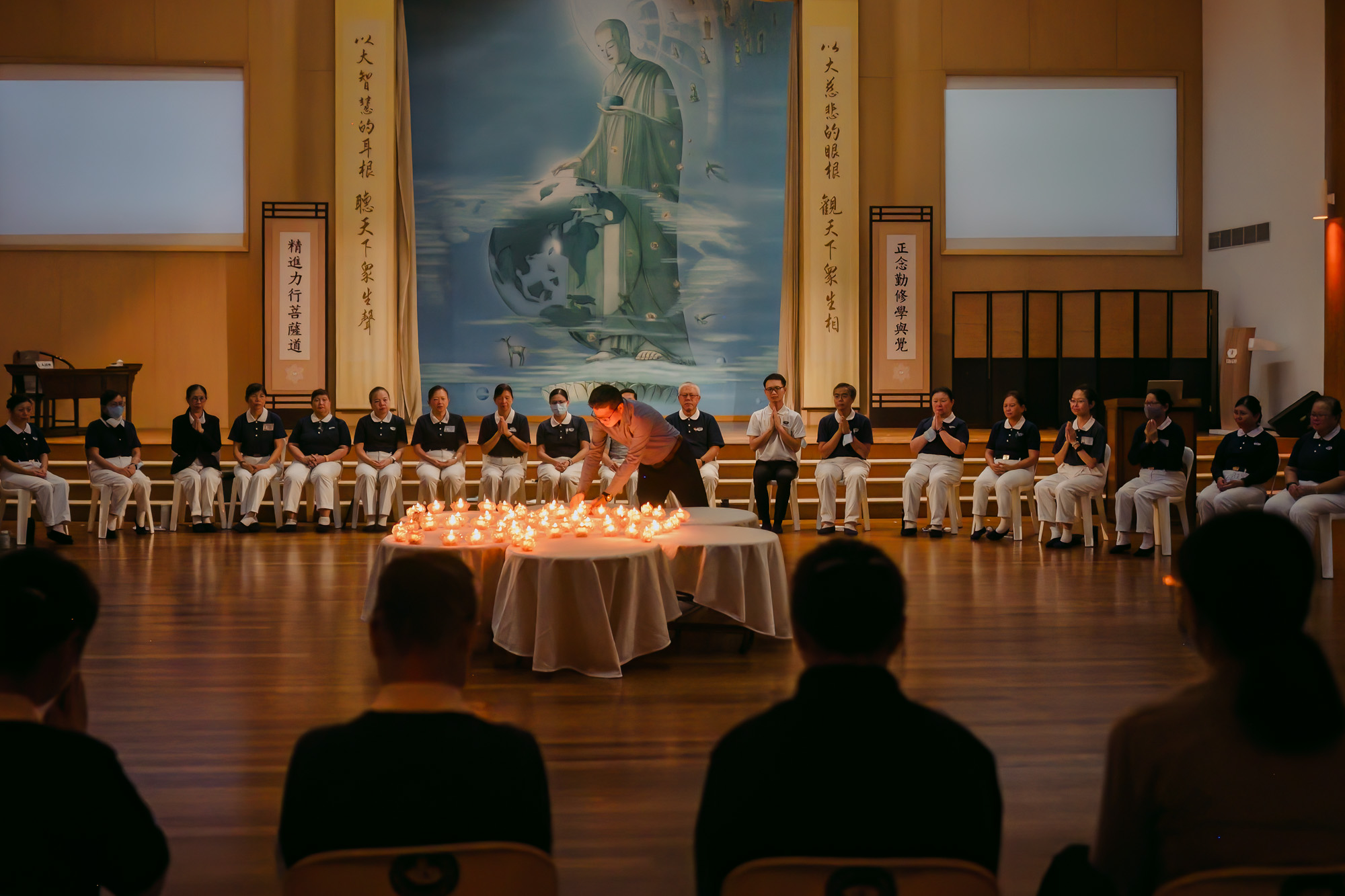 Dr Lo and the workshop participants formed a circle to share insights and heartfelt moments, chant prayers, and light heart lamps. (Photo by Lai Tong Heng)