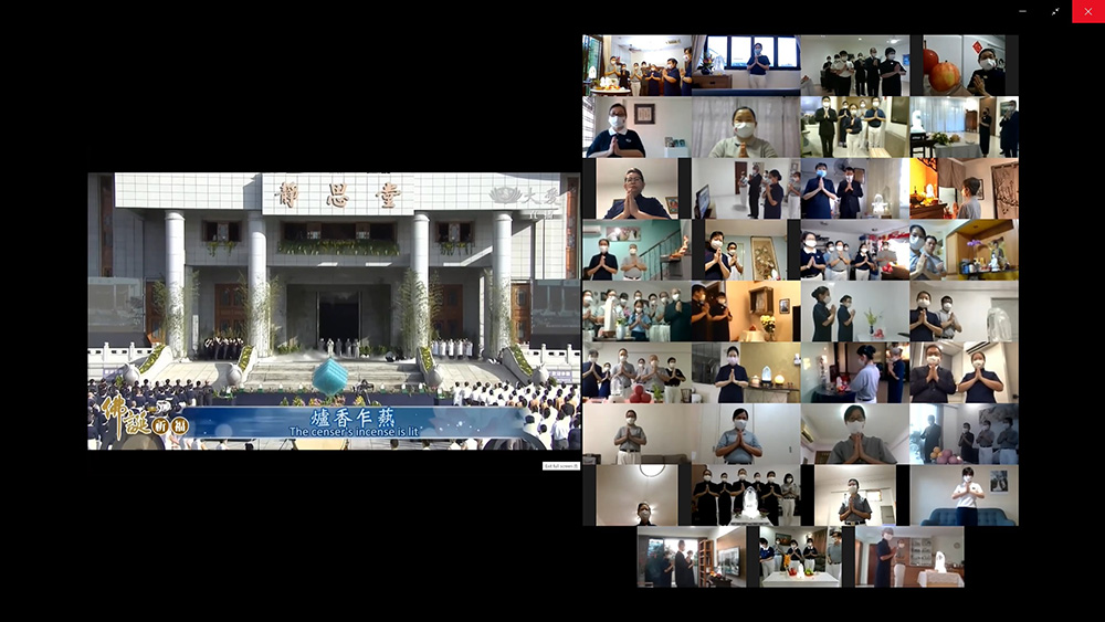 东区志工采用Zoom平台的“一线多视窗”,同步参与庄严的线上浴佛,就如身处同一时空。(摘自影片截屏)